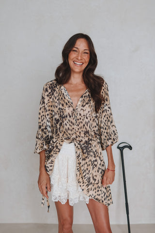 Angel wears the Snow Leopard Asymmetric Blouse + Labyrinth Lace Mini Skirt which features elasticated cuffs, drawstring sides, and an elasticated waistband that ensures a comfortable and customisable fit for a wide range of wearers.